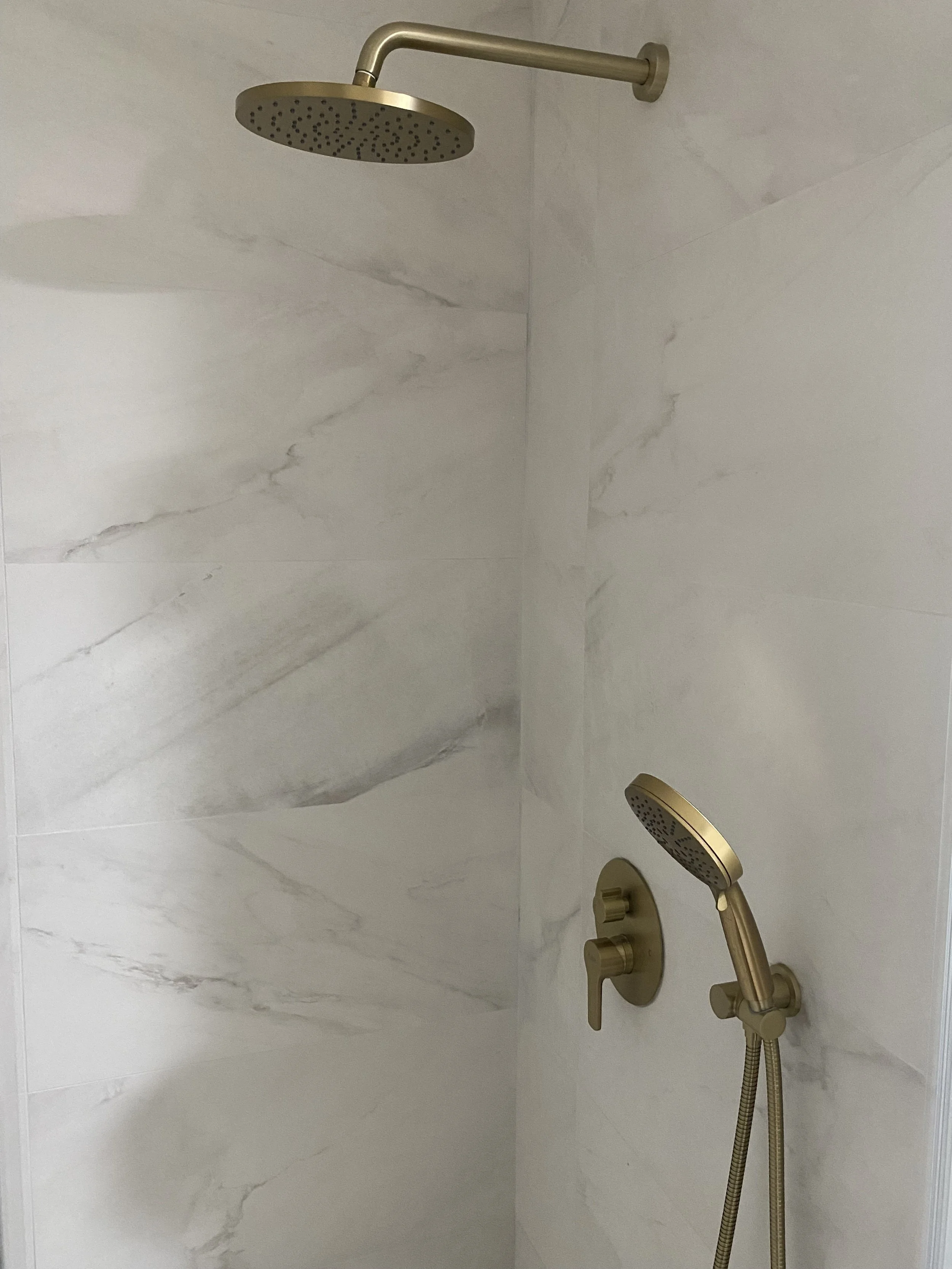 Brushed gold fixtures and accessories unify the space, adding a layer of sophistication without being overly ornate. From the rain shower system to the faucet, towel bars, and lighting sconces, the matte gold finish creates a cohesive and luxurious visual language.