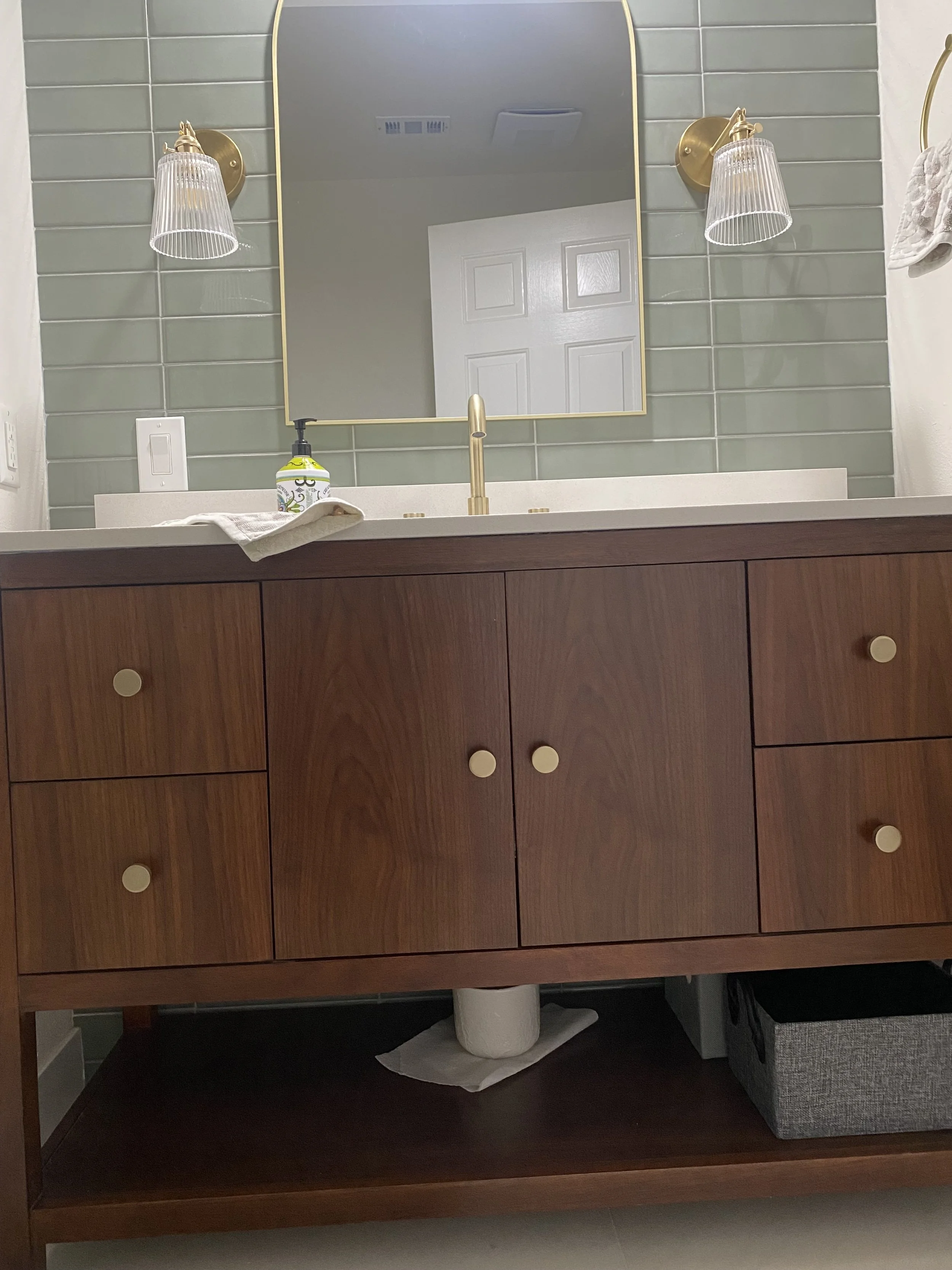 At the heart of the design is a rich, mid-century-inspired wood vanity, which introduces warmth and contrast against the soft sage green vertical subway tiles. The vertical orientation of the tile adds visual height and rhythm to the space, while the curved arch mirror introduces a subtle softness and sculptural quality.