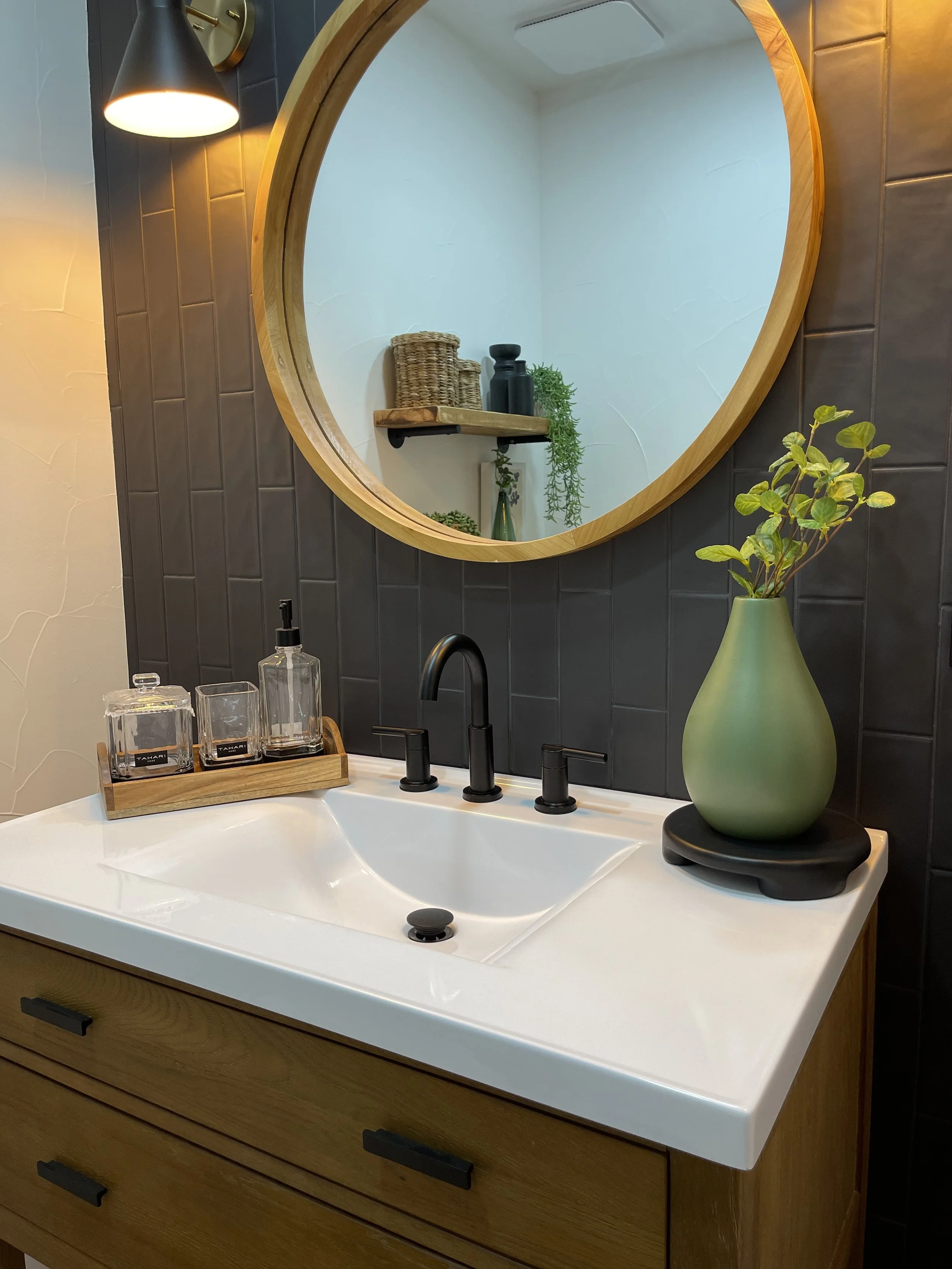 Very small guest bedroom but with lots of character, client wanted something different so I add black accent wall with natural elements throughout the space .
