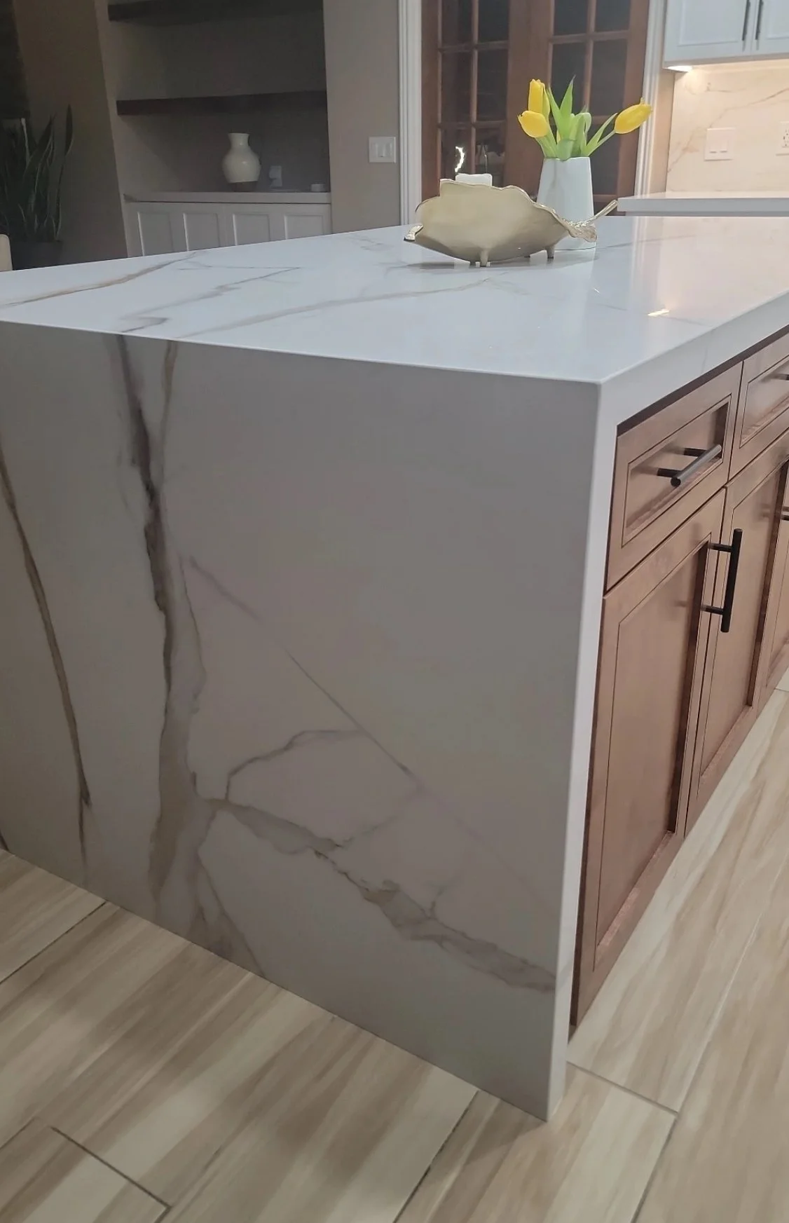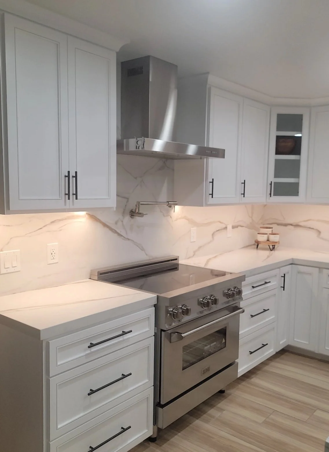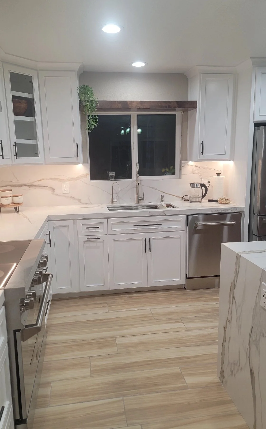 My client wanted to remodel the entire kitchen she requested a modern and western kitchen design. I selected everything from materials to appliances. Kitchen floor I selected a wood-look tile. I selected white kitchen cabinets it was also a custom kitchen design. The countertop completes this kitchen design perfectly.
